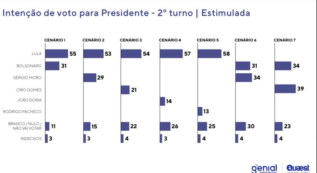 Em um eventual segundo turno, Lula vence em todas situações em que é mencionado, com percentuais variando de 53% a 58% nos cinco cenários dos sete que constam no levantamento. Contra Bolsonaro, o petista vence com o placar de 55% a 33%. E, contra o ex-juiz Sergio Moro (Podemos), o placar é de 63% contra 29%. Contra Ciro Gomes (PDT), Lula vence com 54% contra 21% e, contra João Dória (PSDB) o placar passa para 58% a 14%. E, contra Rodrigo Pacheco (PSD) a vantagem é maior ainda, de 58% contra 13%.